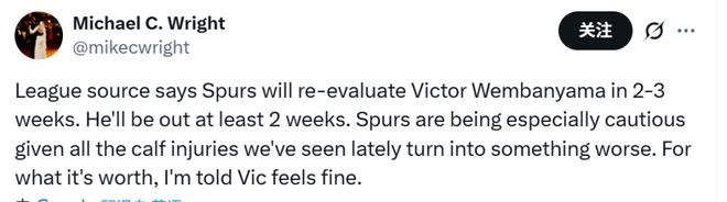 “联盟消息人士透露,马刺队将在两到三周后重新评估文班亚马的伤情,他至少会休战两周。鉴于近期有多起小腿伤势后续恶化的情况出现,马刺队此次处理格外谨慎。另外说句供参考的话,据称文班亚马本人感觉并无大碍。”