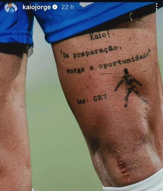 在凯奥-若热社交媒体晒出的照片中,他的左大腿上纹有C罗标志性庆祝动作的图案,文字内容为C罗曾经给他的建议“凯奥,机会源于准备”。